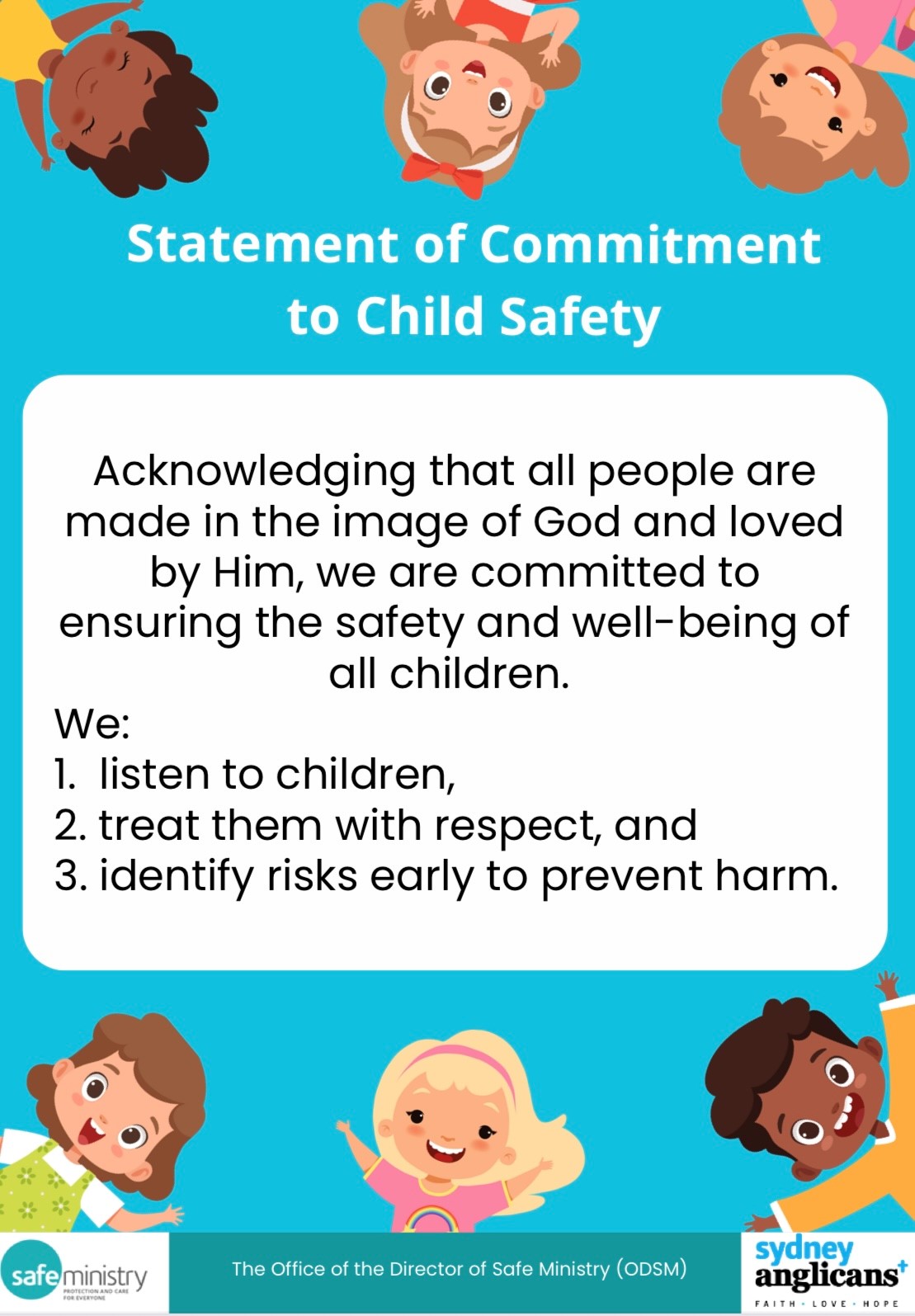 A Statement of Commitment to Child Safety communicates to the whole church and wider community that keeping children safe is a priority. It also sets the expectation that keeping children safe is everyone’s responsibility.